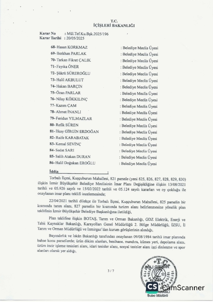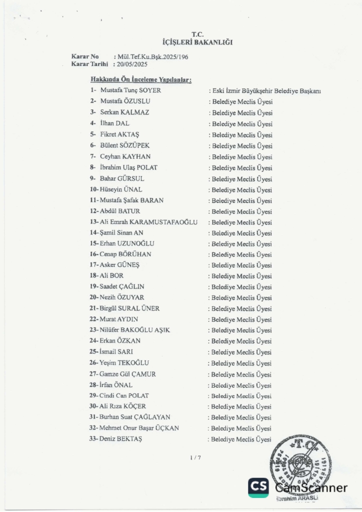 İçişleri Bakanlığı, 20 Mayıs 2025 tarihli kararıyla, aralarında eski İzmir Büyükşehir Belediye Başkanı Tunç Soyer ve çok sayıda meclis üyesinin bulunduğu 86 kişi hakkında soruşturma izni verdi.