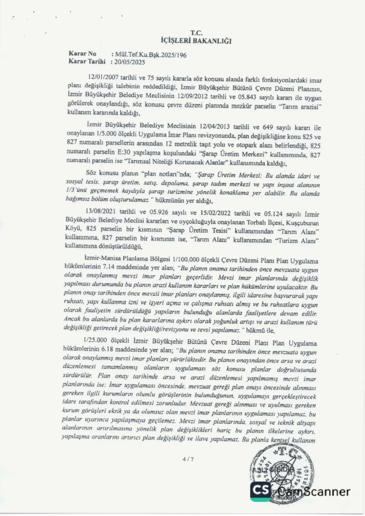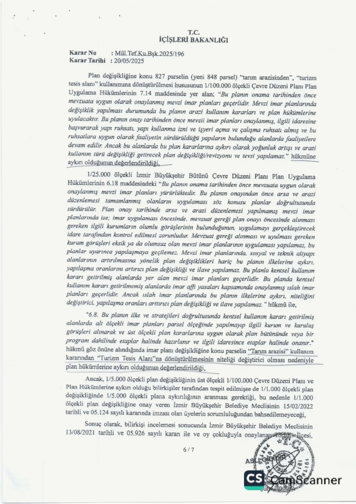 “Tarım arazisinin turizm tesis alanına dönüştürülmesi, 1/100.000 ölçekli Çevre Düzeni Planı hükümlerine aykırıdır.