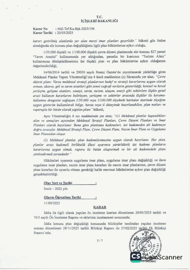 “Tarım alanı niteliğindeki parsellerin, plan kararlarına aykırı şekilde turizm alanına dönüştürülmesi.”