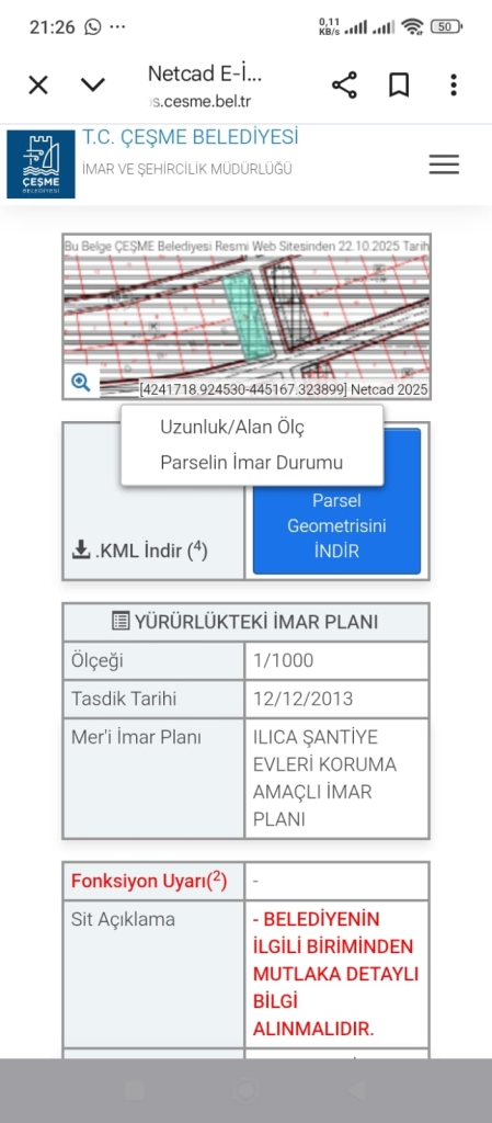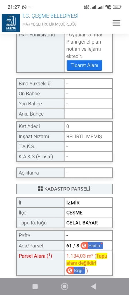 Şu anki imar sorgusunda, bina yüksekliği belirtilmemiş, kat adedi sıfır, inşaat nizamı “belirtilmemiş” görünüyor.
