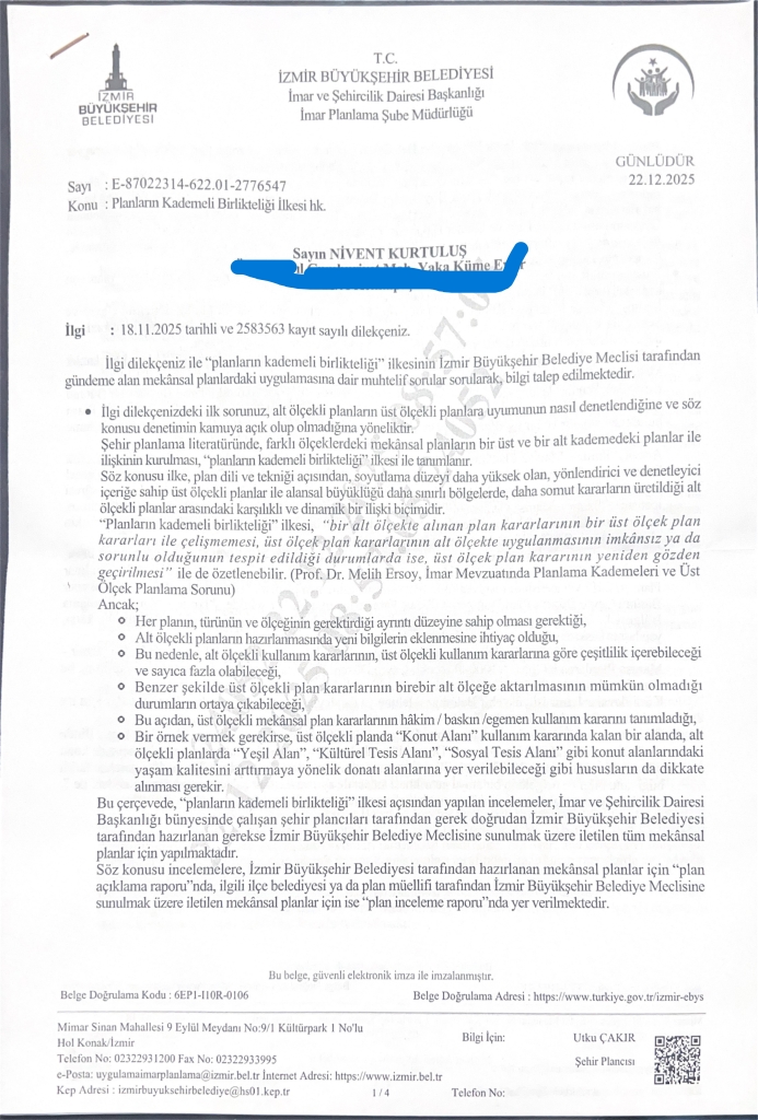 - İzmir’de son 3 yıl içerisinde hazırlanan veya revize edilen 1/5000 ölçekli nazım imar planlarının,1/25.000 ölçekli nazım imar planına uygunluk denetimi nasıl yapılmaktadır? Bu uygunluk raporları kamuya açık mıdır?