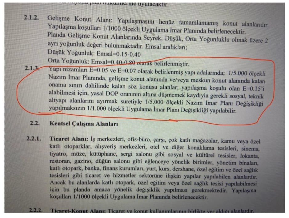 Yasal DOP oranının altına düşmemek kaydıyla gerekli sosyal teknik altyapı alanlarını ayırmak suretiyle 1/5000 ölçekli Nazım İmar Planı Değişikliği yapılmaksızın ( zaten fırsat vermediniz bir avazda- pardon mecliste- hepsini onayladınız ..) 1/1000 ölçekli Uygulama İmar Planı değişikliği yapılabilir (üşenmemiş onu da hemen yapmışlar buda aradan çıksın diye ) denmiş Hepsini anladık iyi niyeti de anladık da verilen yasal DOP oranını plan üzerinde bulamadık ..ÇOK İYİ SAKLAMIŞLAR parselleri birebir koruyup Emsali 0.15 yapıp inşaat hakkını 3 kata çıkarmışlar 0 (yazı ile sıfır) zayiat ile .. yetti mi acaba 3 katına çıkarmak ? ESKİ DE OLSA PROJE MÜELLİFLERİNE BAKMAYIN SAKIN ONA DA ŞAŞIRIRSINIZ…..
