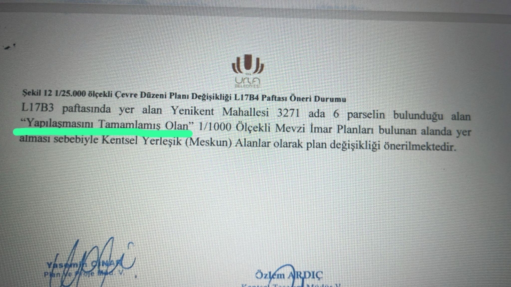 Urla Yenikent Mahallesinde 3271 ada, 6 parselin yapılaşmasını tamamlamış olan mevzii imar planları bulunması sebebi ile “KENTSEL YERLEŞİK (MESKUN)ALANLAR “ olarak plan değişikliği önerilmiştir. Eyvah Eyvah bir tabu daha yıkılıyor , diğer parselleri EMSAL gösterip burası da meskun Alan olsun … Bunu da gördük Süphanallah Maşallah
