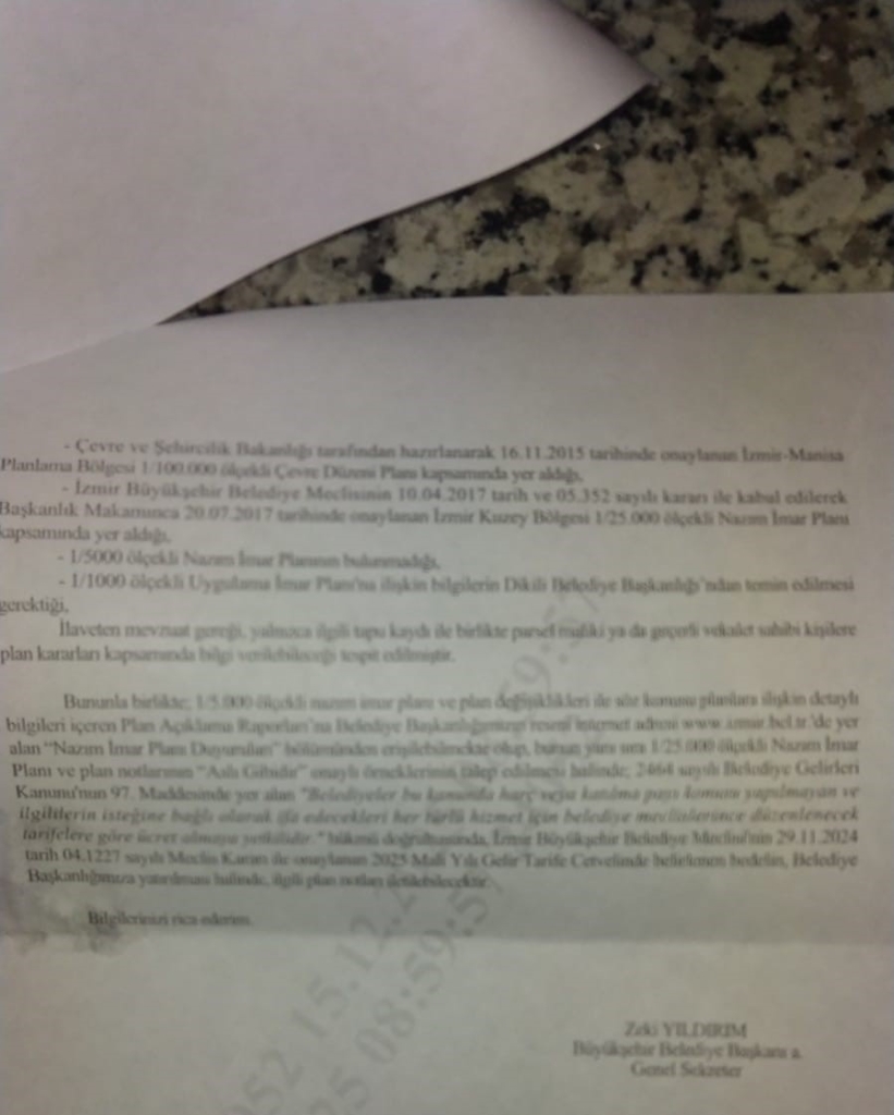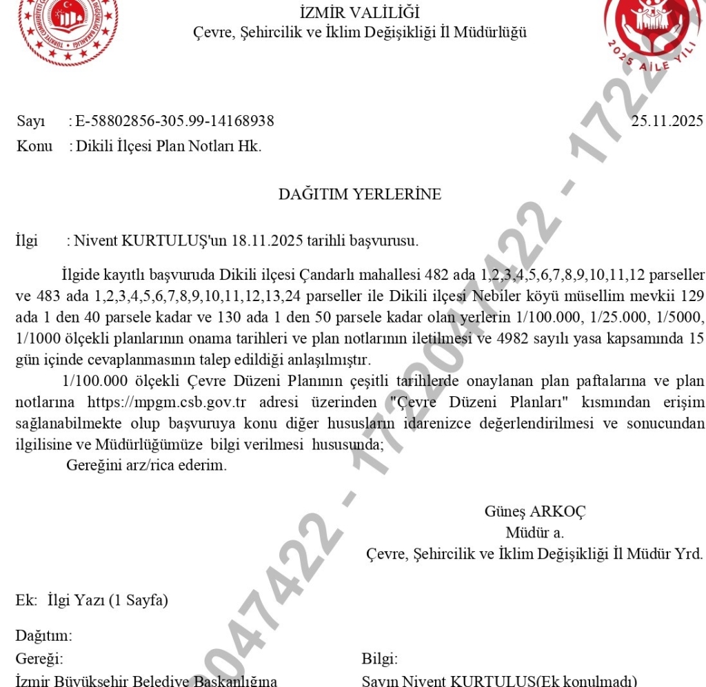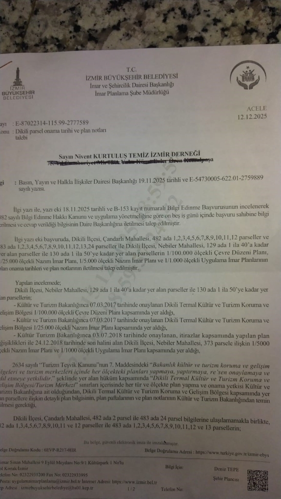 İzmir Büyükşehir Belediyesi ve ilgili kurumlar tarafından verilen resmî yanıtlarda, Çandarlı ve Nebiler bölgelerindeki bazı parsellerin “Dikili Termal Kültür ve Turizm Koruma ve Gelişim Bölgesi” kapsamında yer aldığı, planlama yetkisinin de 2634 sayılı Turizmi Teşvik Kanunu’nun 7. maddesi uyarınca Kültür ve Turizm Bakanlığı’nda olduğu ifade edildi.