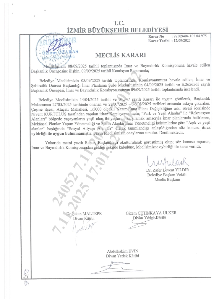 “Yapılan itiraz, İzmir Büyükşehir Belediye Meclisinin 12.09.2025 tarihli ve 04.975 sayılı kararı ile uygun bulunmamıştır.”